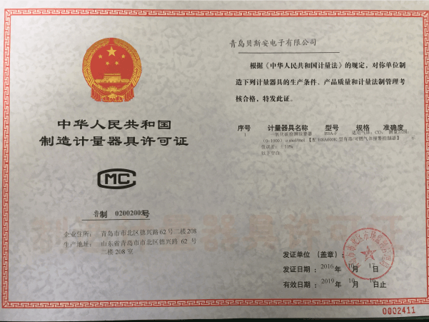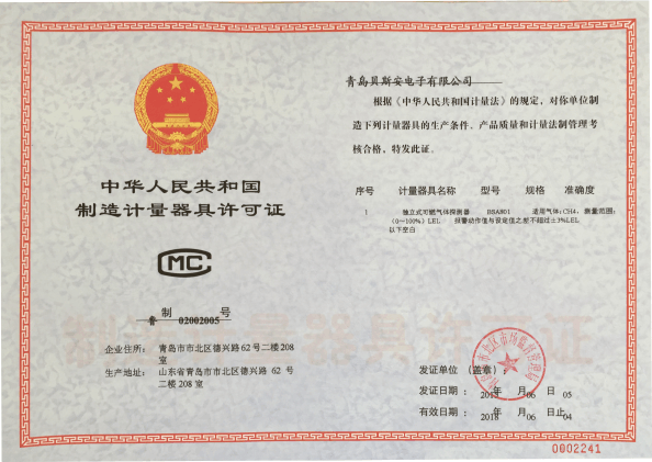 我公司是青島市具有國(guó)家質(zhì)量技術(shù)監(jiān)督部門頒發(fā)的計(jì)量器具生產(chǎn)許可證的生產(chǎn)企業(yè);獲得國(guó)家防爆電氣產(chǎn)品質(zhì)量監(jiān)督檢驗(yàn)中心頒發(fā)的防爆合格證;獲得國(guó)家公安部消防產(chǎn)品合格評(píng)定中心頒發(fā)的消防產(chǎn)品形式認(rèn)可證書(shū)。